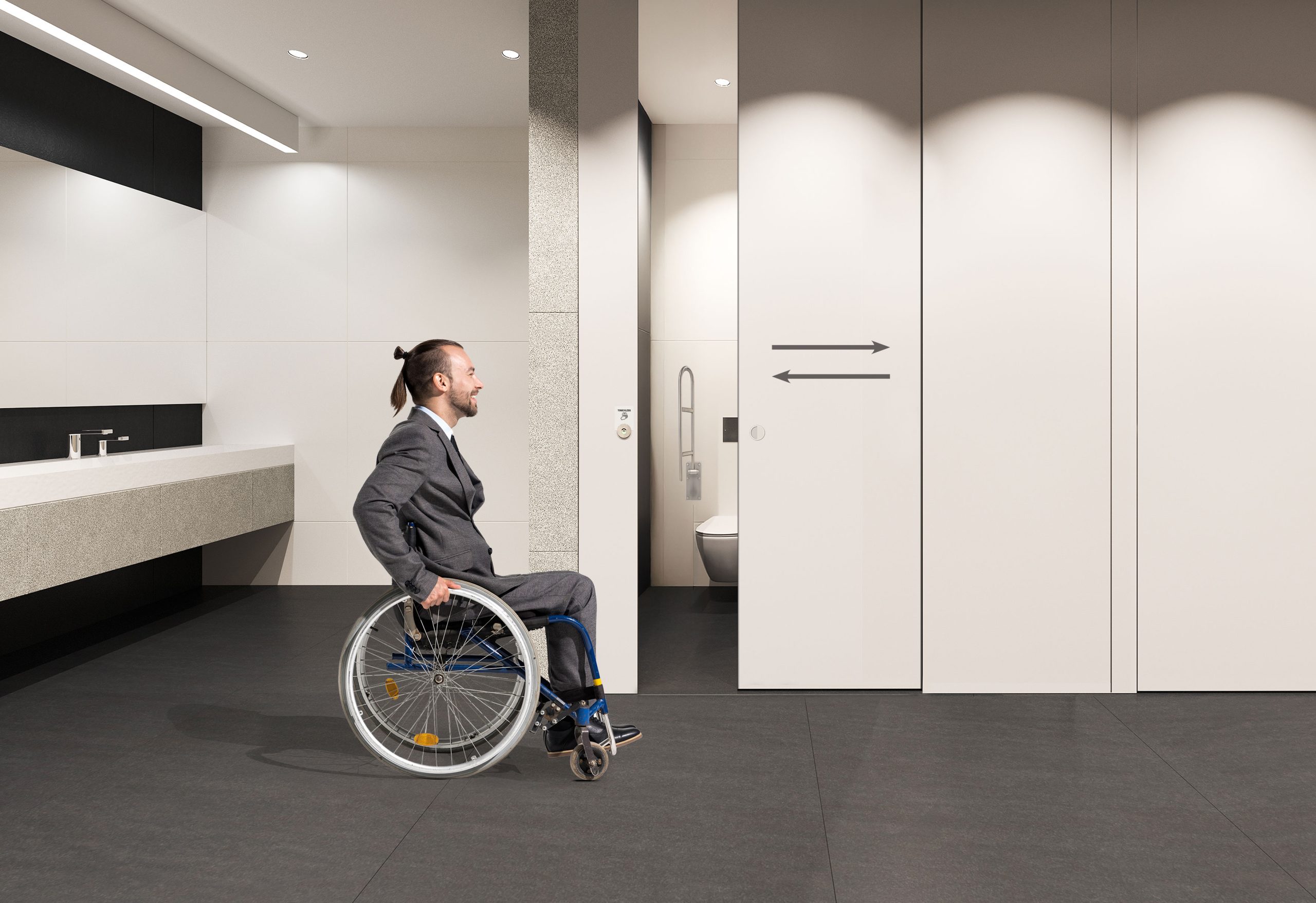 The Stern’s Patented ADA Accessible Partitions have a smart configuration that allows for either: sliding, inward- or outward- touch-free automatic doors, depending on the spatial and code requirements of your project. This flexibility ensures proper clearance, user comfort, and full wheelchair accessibility while maintaining a compact and efficient footprint—ideal for high-traffic environments such as airports, offices, cultural venues, and transportation hubs.